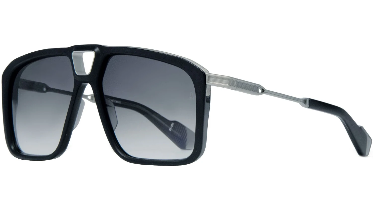 Matte black acetate and titanium frame with custom temple tips and purple lenses. Silver hardware. Grey gradient CR-39 lens, 6 base with backside anti-reflective treatment. 100% UV protection.