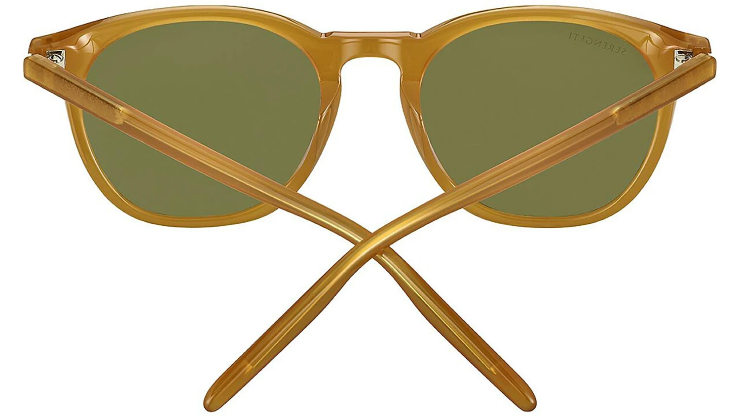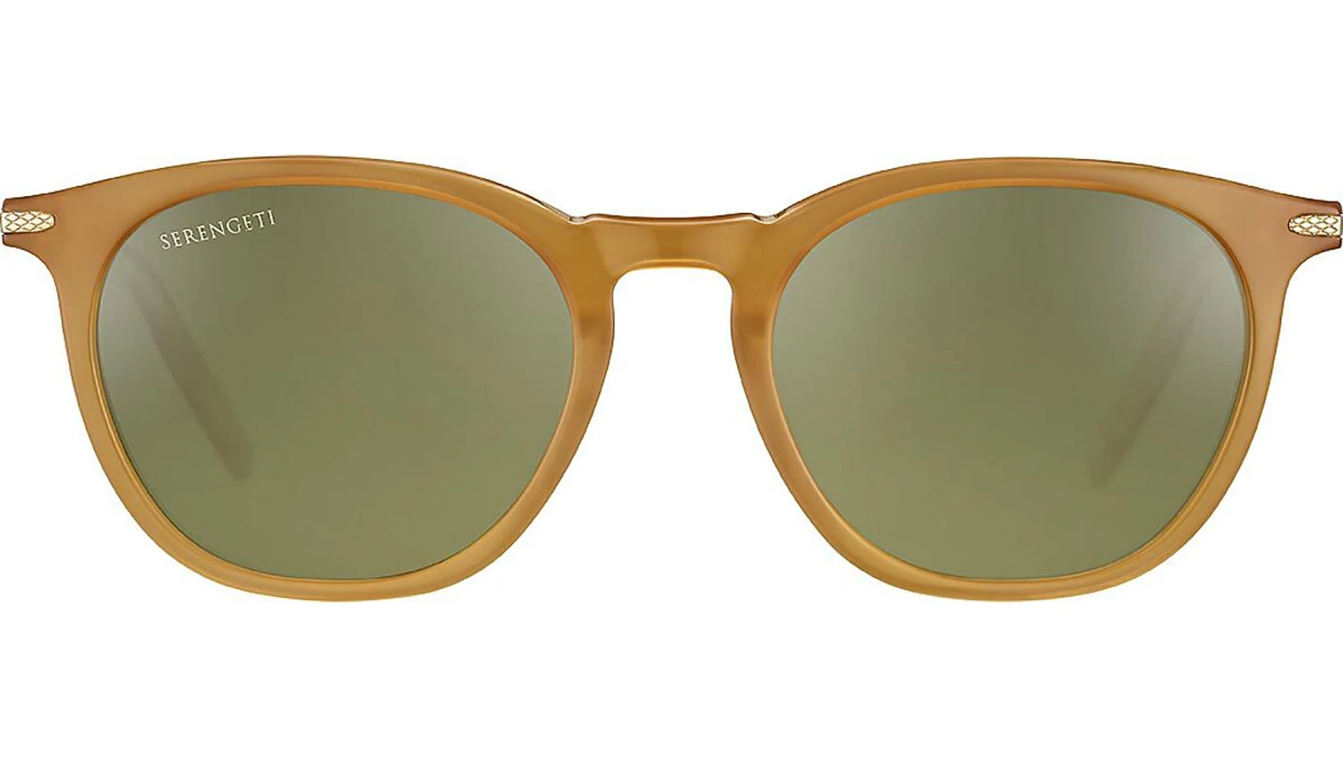 Serengeti Arlie sunglasses featuring honey shiny rectangular bio acetate frame and green lenses. The ARLIE sunglasses feature a unisex round shape with a subtle key nose design that enhances their modern aesthetic. They are equipped with mineral polarized 555nm lenses, ensuring optimal visual clarity and protection. Constructed from bio-acetate, the frame offers both sustainability and durability. The lenses fall into category 3, with a base curve of 6, providing a comfortable fit for medium face sizes. Made in Italy, the lenses boast key features including ultra-light mineral composition, photochromic properties, polarized technology, spectral control, and an anti-reflective coating. Style code: SS483. Color code: 005. Authorized Serengeti online reseller. Your glasses will include the original case and accessories and are covered by a 12-month global warranty.