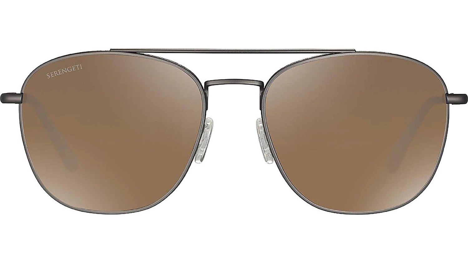 Serengeti Carroll Large sunglasses featuring matte dark gunmetal pilot metal frame and brown lenses. The Carroll Large sunglasses feature a double bridge design influenced by classic Serengeti frames. Available in two sizes, these sunglasses come equipped with mineral polarized Drivers lenses. The frame is constructed from metal, with lens categories ranging from 2 to 3 and a base curve of 6. Designed to fit large head sizes, these sunglasses are manufactured in Italy. Key lens features include an ultra-light mineral lens that is photochromic, polarized, and equipped with spectral control for enhanced visual clarity. Style code: SS598. Color code: 004. Authorized Serengeti online reseller. Your glasses will include the original case and accessories and are covered by a 12-month global warranty.