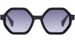 Gigi Studios Eyewar sunglasses model 6455 Shirley color code 1 in black. A classic geometric full rim acetate glasses with black gradient lenses. The brand ensures the highest quality through their meticulous selection of materials, partnering with top suppliers from Italy, Germany, and Japan. Gigi Studios provides an exceptional visual experience with CR-39 lenses that are comfortable and secure, effectively absorbing UVA and UVB rays.