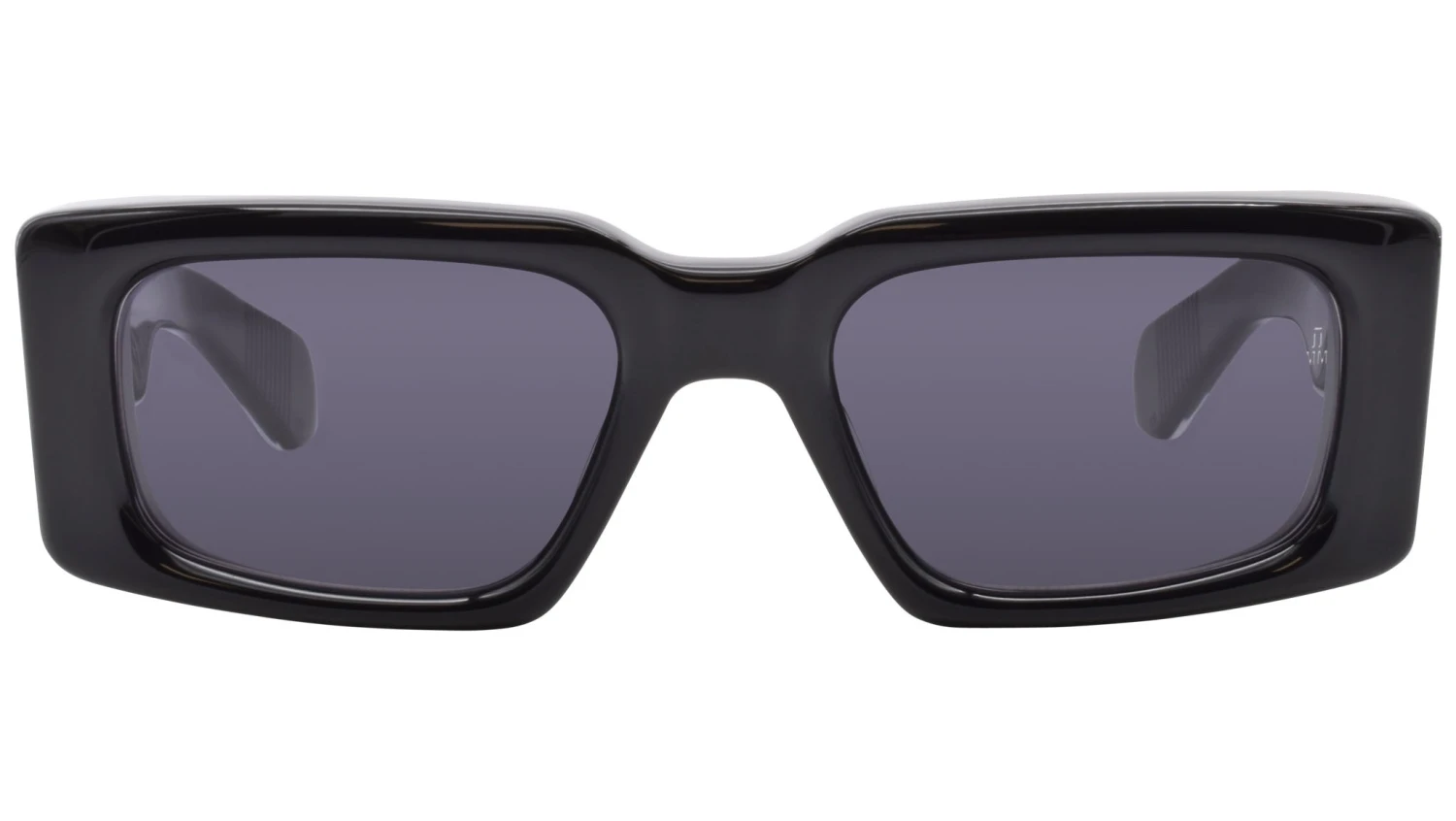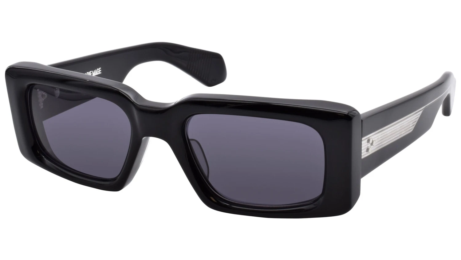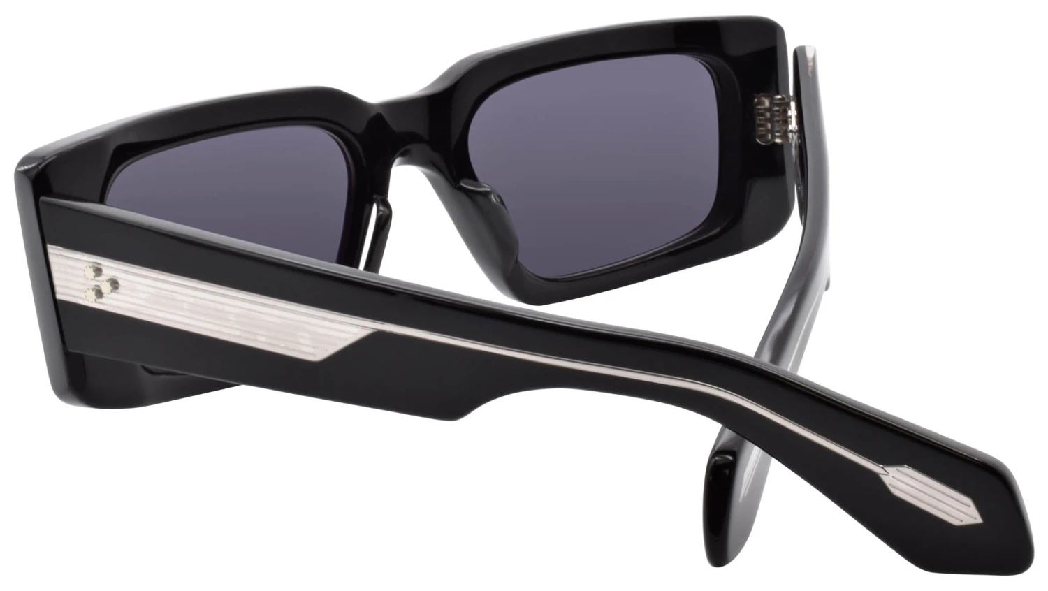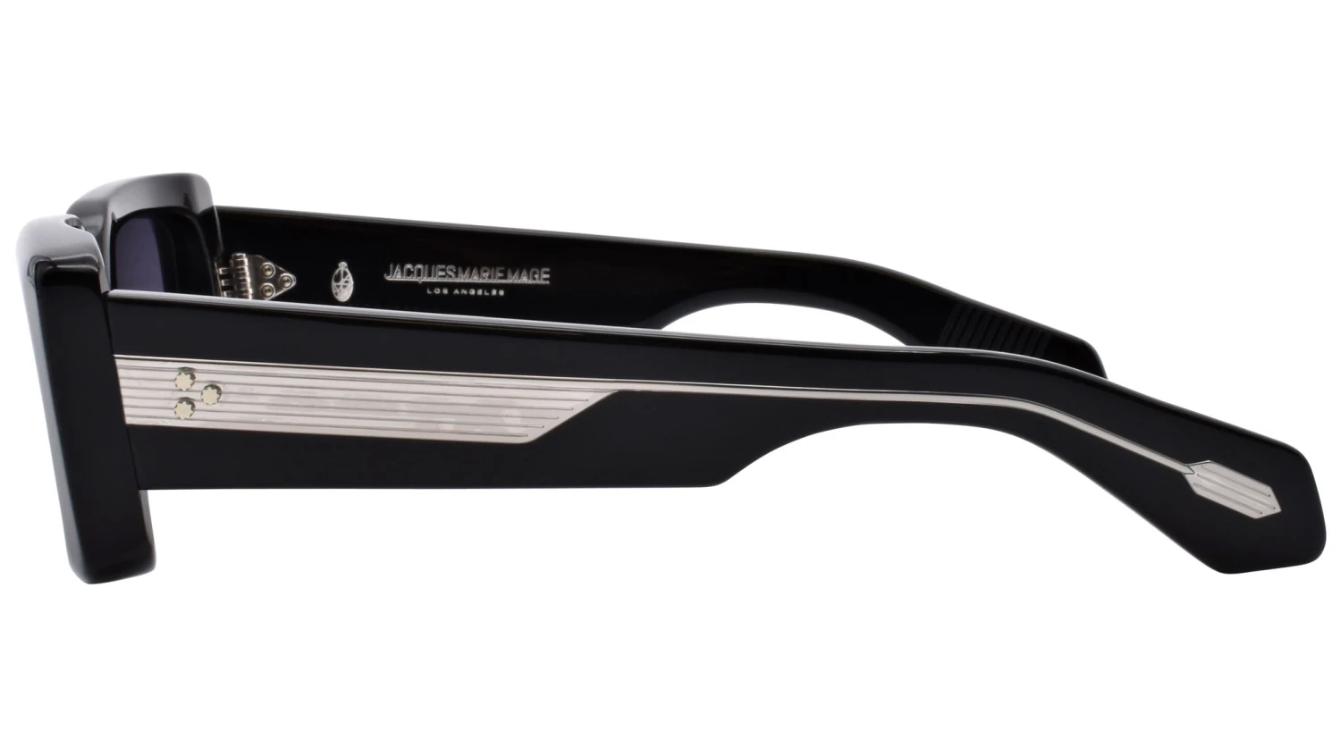 Black 9mm cured cellulose acetate frame custom acetate temples and black lenses. Exposed wirecore. Sterling silver tension secured custom 9 barrel hinge. Jet black CR-39 8 base lens with backside anti-reflective treatment. 100% UV protection.