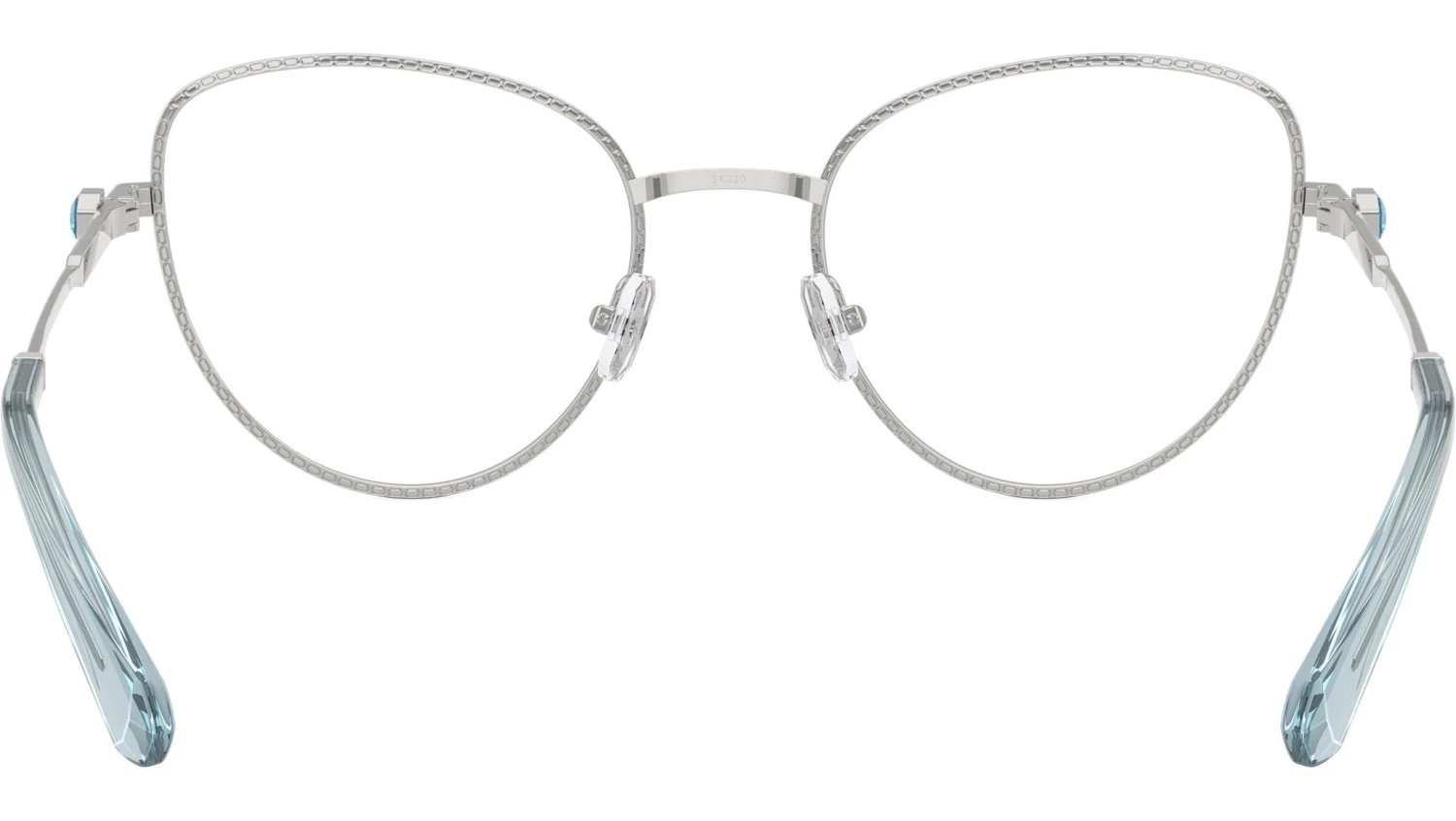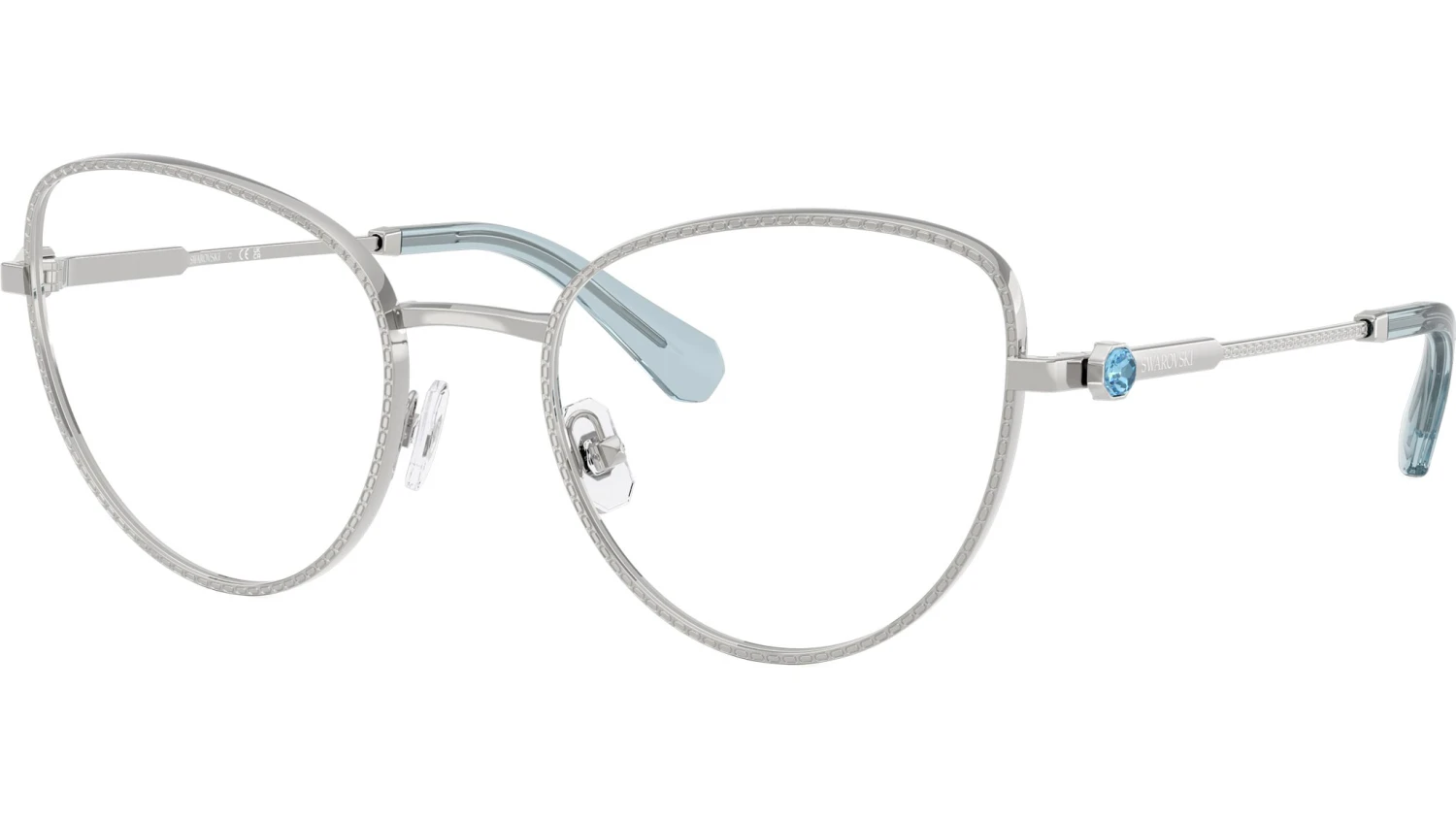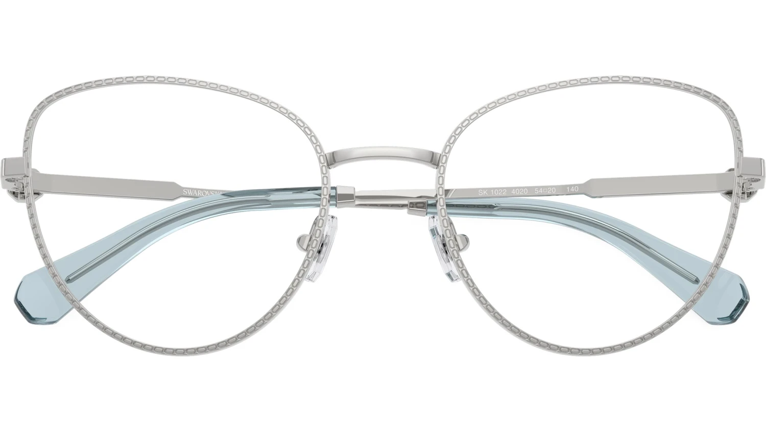 Swarovski SK1022 4020 glasses for women, featuring silver cat eye metal frame and demo lenses. Adjustable nosepads. Brand line: Science of Facets. Style code: SK1022. Color code: 4020. Authorized Swarovski online reseller. Your glasses will include the original case and accessories and are covered by a 12-month global warranty.