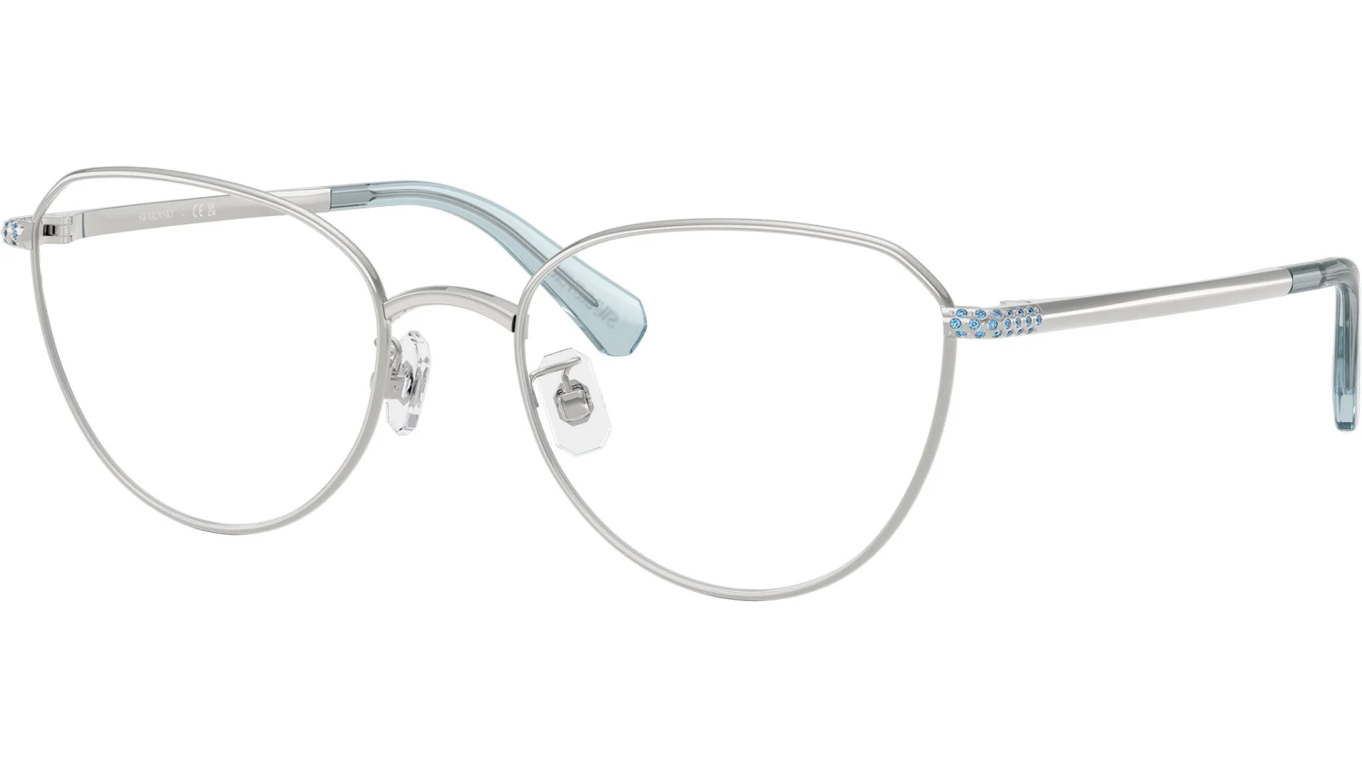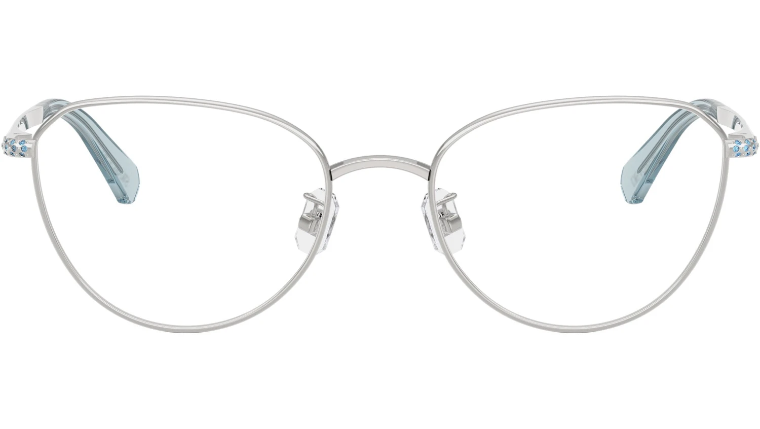 Swarovski SK1029D 4020 glasses for women, featuring silver round metal frame and demo lenses. Low bridge fit. Brand line: Science of Facets. Style code: SK1029D. Color code: 4020. Authorized Swarovski online reseller. Your glasses will include the original case and accessories and are covered by a 12-month global warranty.