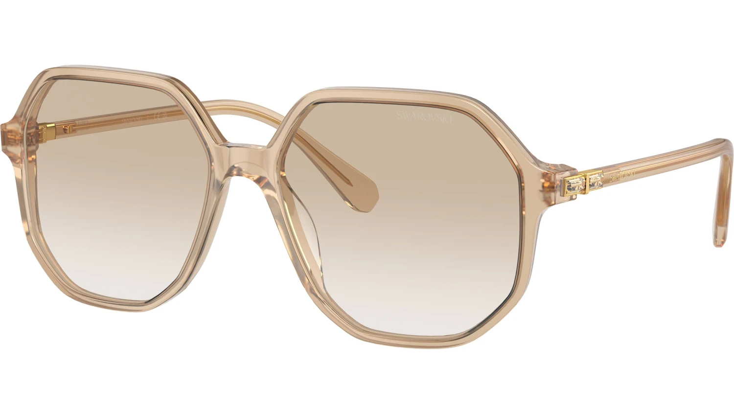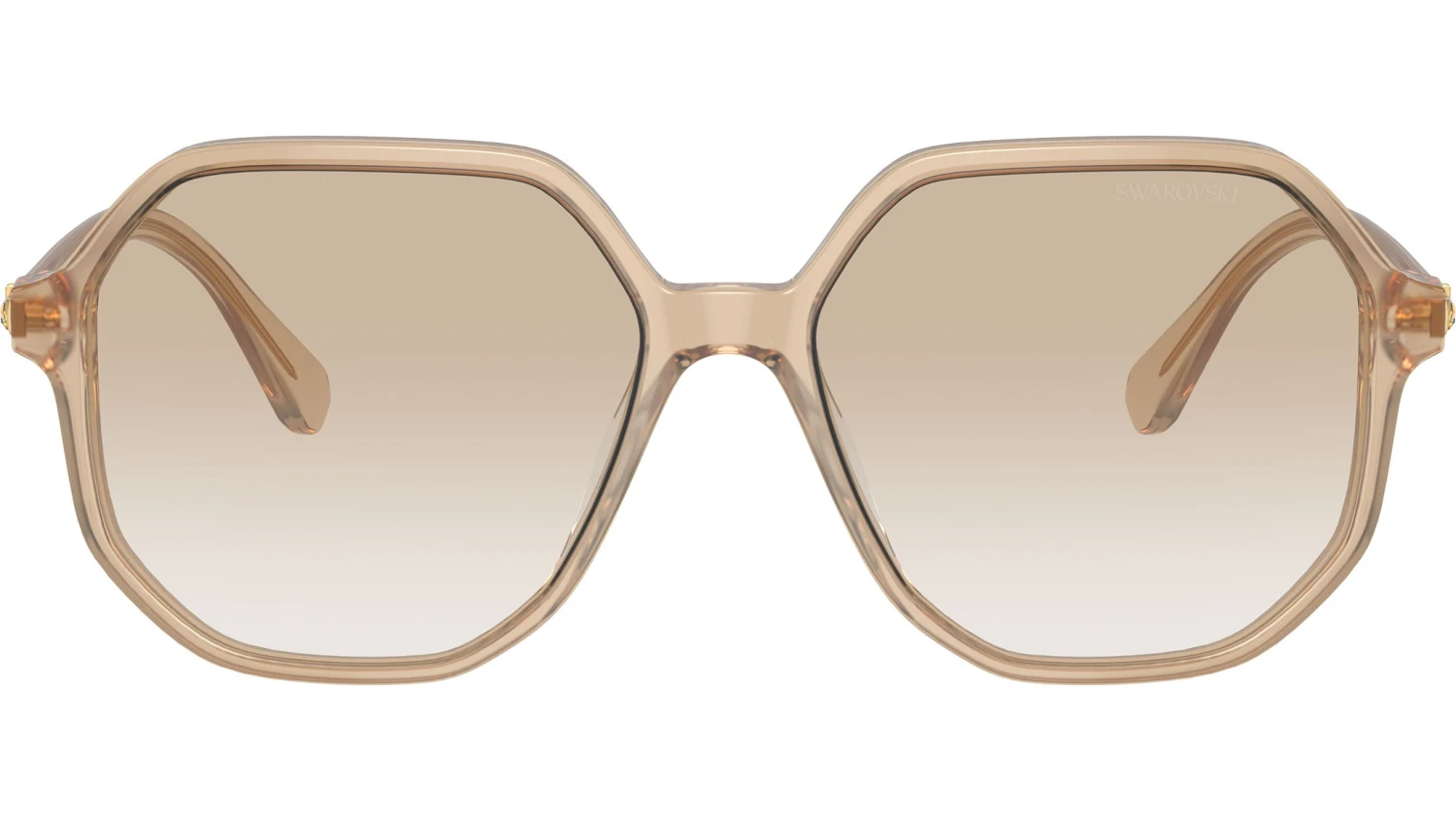 Swarovski sunglasses for women model 6003 featuring opaline light brown full rim acetate frame and base 4 gradient light grey lenses. High bridge fit. Frame line: Science of Facets. Brand code: 0SK6003. Color code: 103411. Authorised Swarovski Eyewear Online Reseller. Your glasses will come including the original case and accessories and will be covered by 12 month global warranty.
