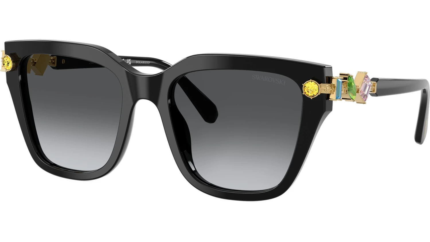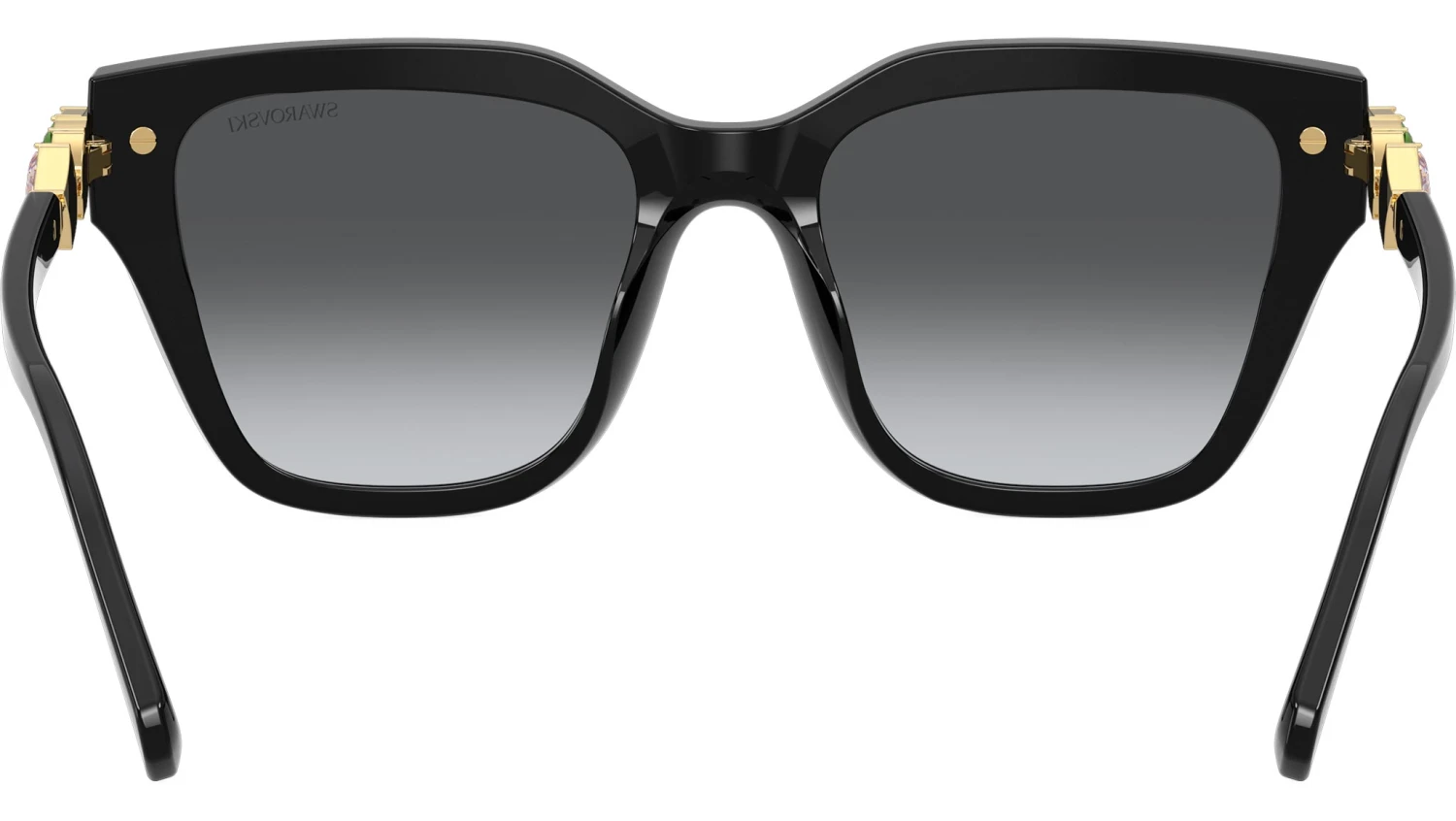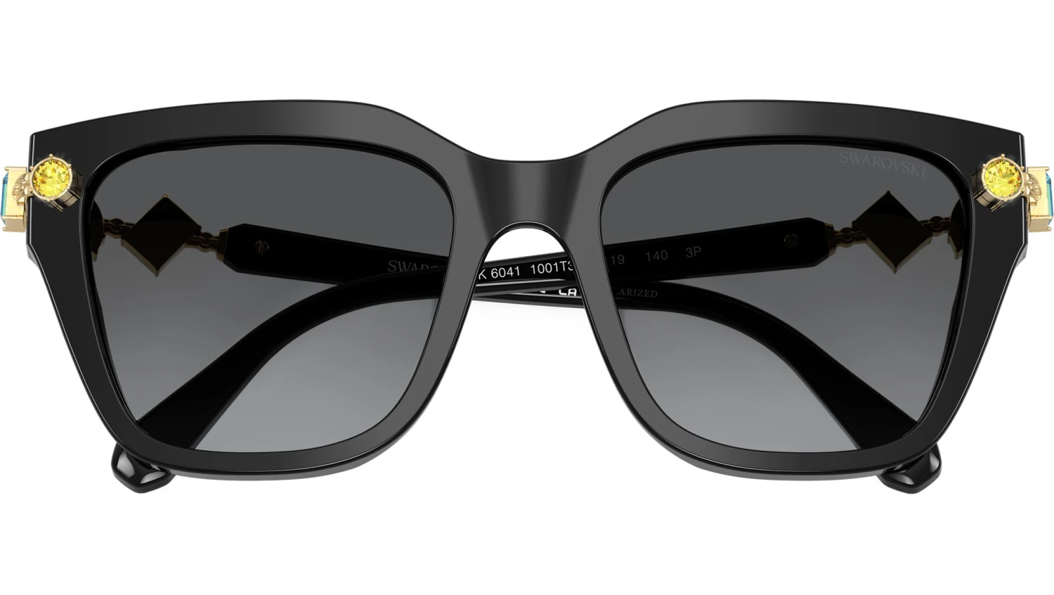 Swarovski SK6041 1001T3 sunglasses for women, featuring black geometric acetate frame and polar grey gradient CR-39 lenses. High bridge fit. Brand line: Science of Facets. Style code: SK6041. Color code: 1001T3. Authorized Swarovski online reseller. Your glasses will include the original case and accessories and are covered by a 12-month global warranty.