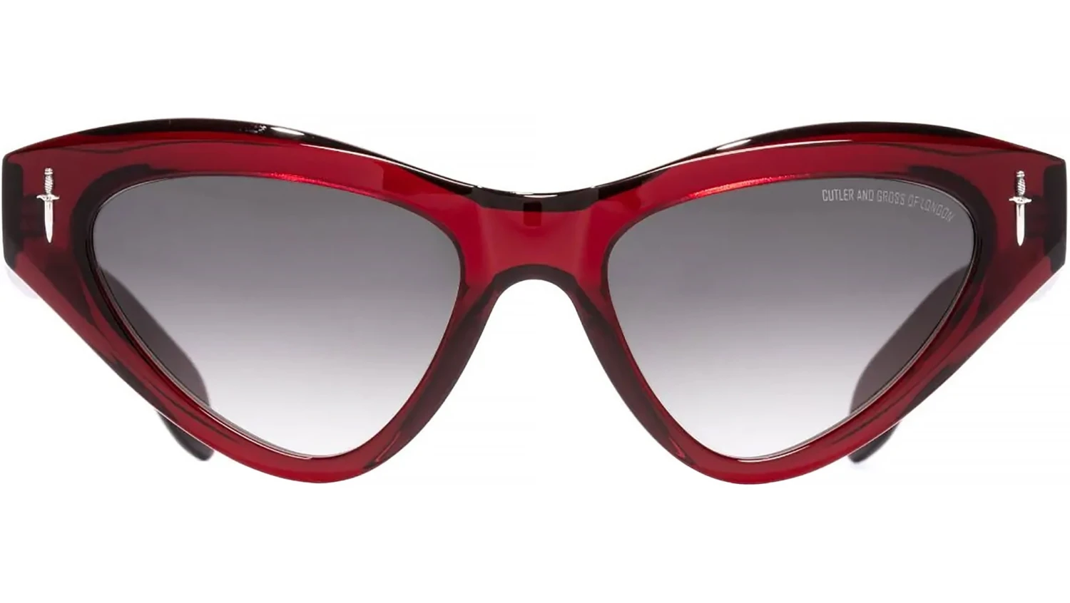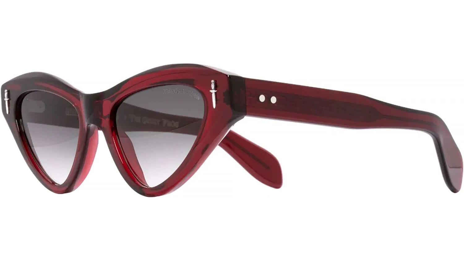 The Great Frog 009 Mini Cat Eye 03 Bordeaux. Cat-eye sunglasses take an irreverent turn, courtesy of The Great Frog collaboration. This iteration is crafted by hand to an exaggerated 50s-inspired silhouette and spliced by Dagger frontal pins in Sterling Silver. A custom Lock Down chain core wire threads through the temples.