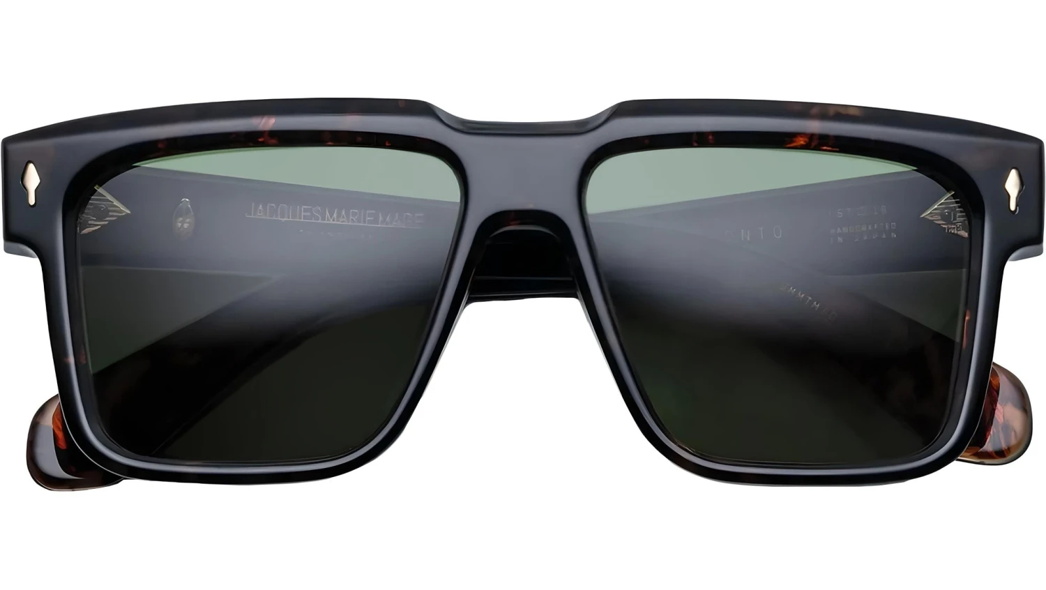 Jacques Marie Mage Tramonto are squared racer sunglasses, part of the Valentino Rossi for JMM Collection and inspired by the ‘Tramonto curve’ of the Misano Circuit. They feature a havana 10mm cured cellulose acetate frame with a sculptural brow and wide fit, custom double-laminated acetate temples, dark gold signature arrowhead front pins, exposed classic wirecore, Valentino Rossi’s signature ‘SoleLuna’ crest on the temple tips, and green 6 base CR-39 lenses with backside anti-reflective treatment and 100% UV protection.