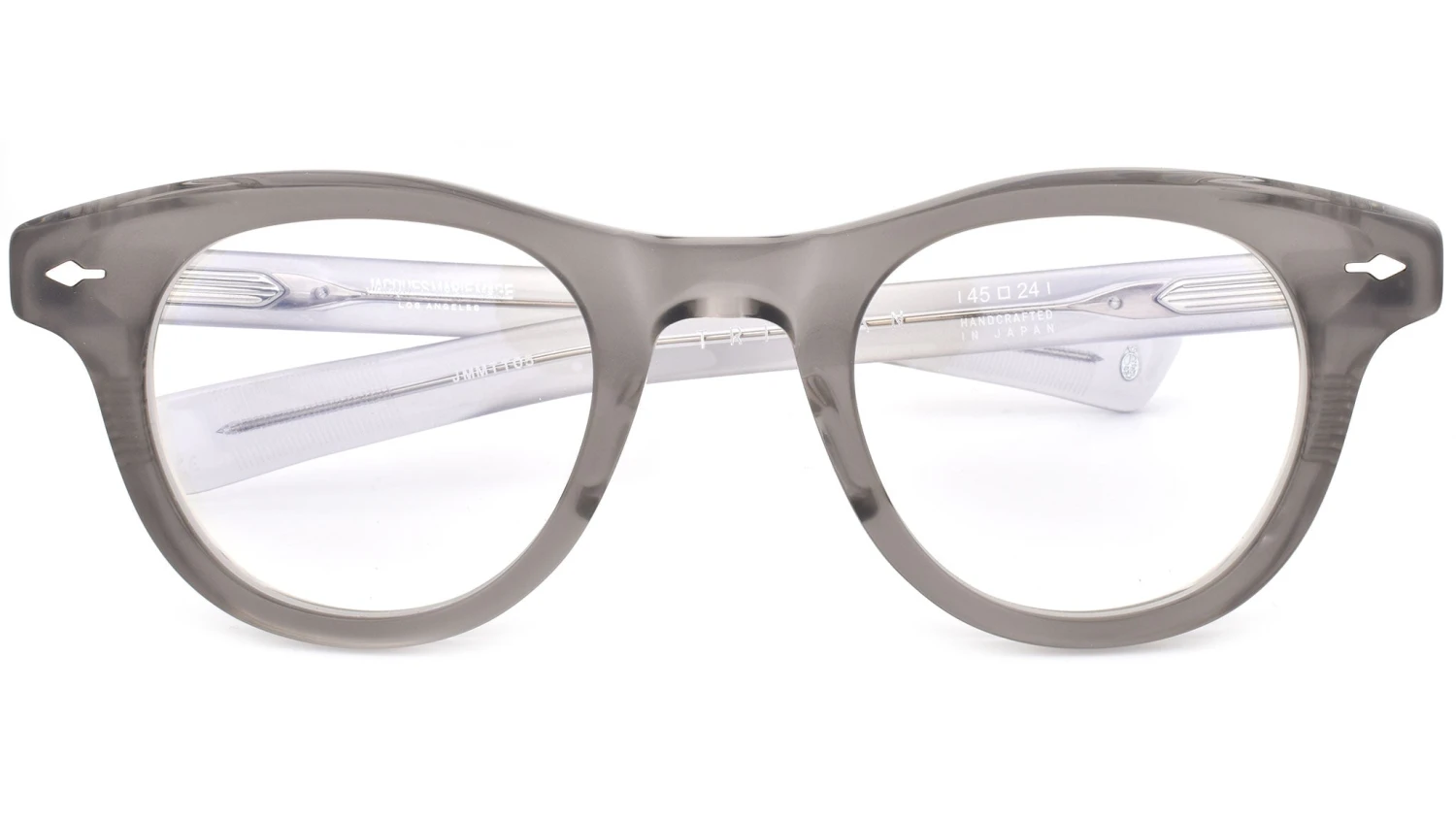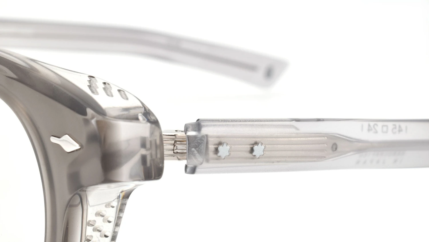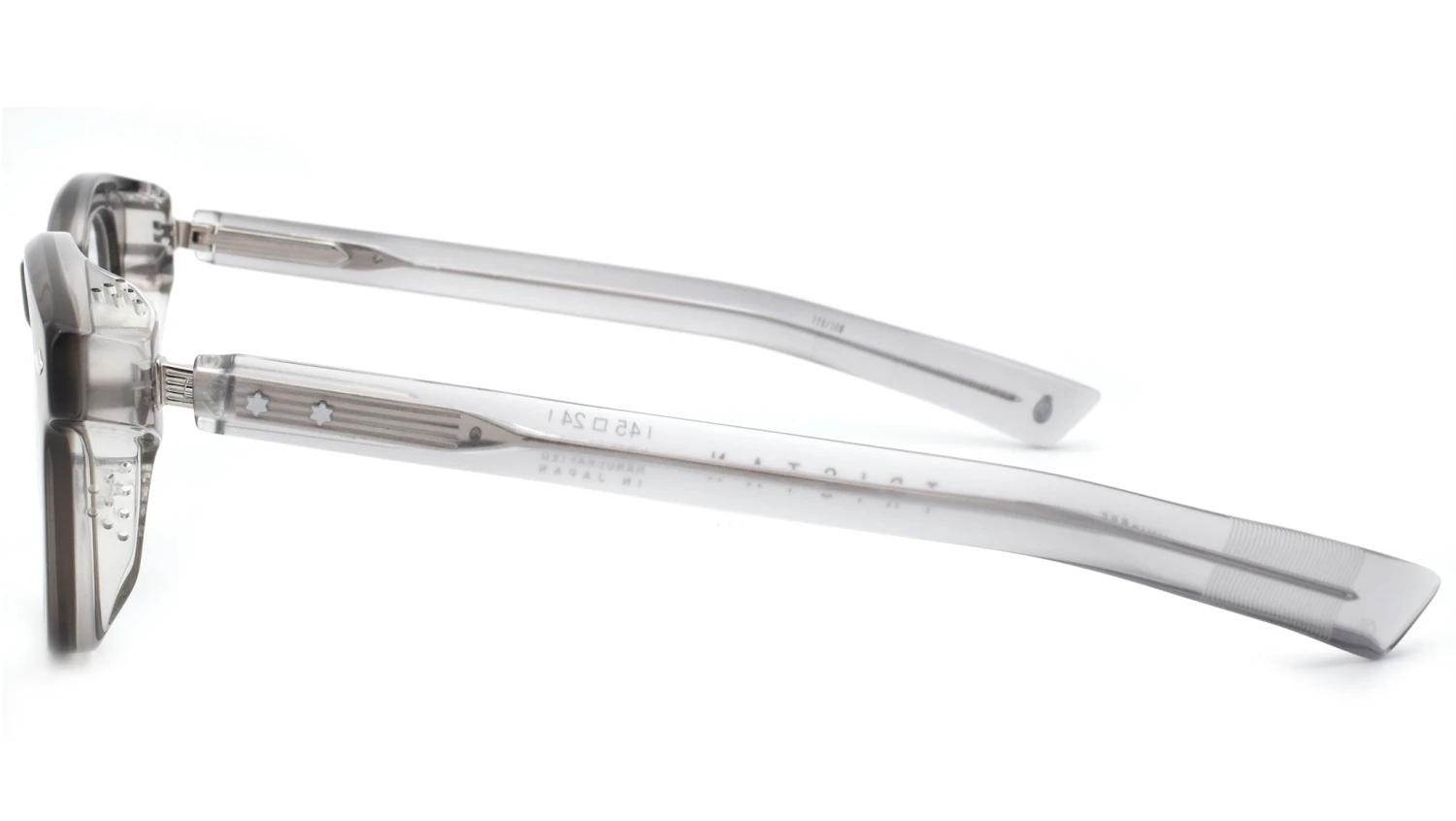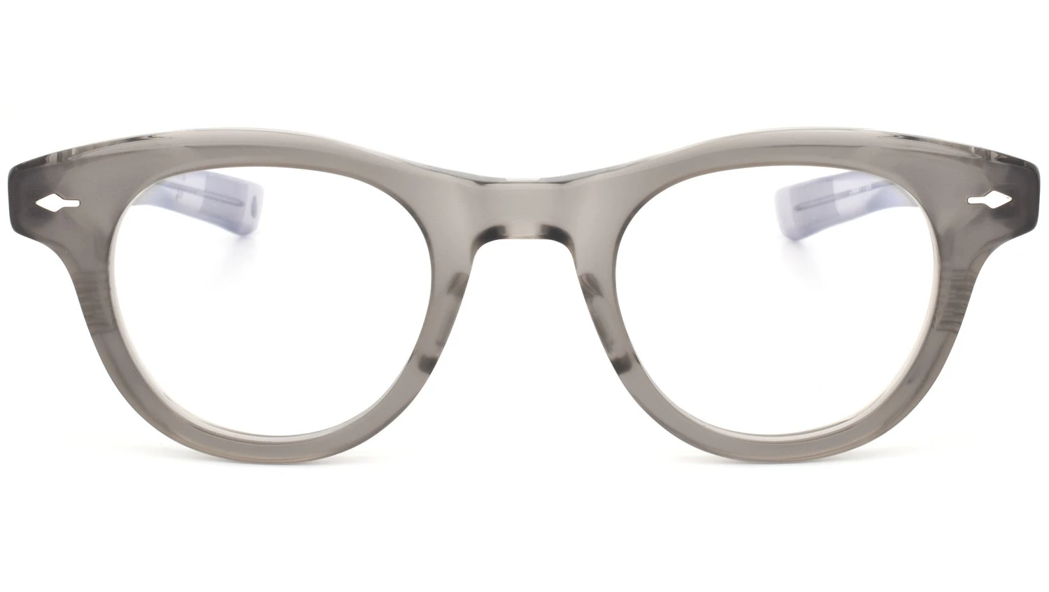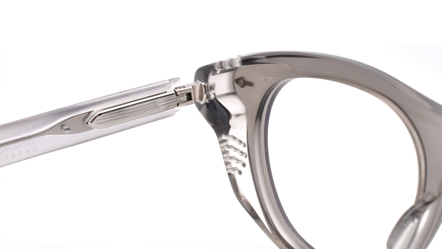 12mm block, dark and light smoke acetate frame, custom floating hinge system. Hardware: sterling silver. Pantoscopic shape with intensive volume cut out. sterling silver signature arrowhead front pin. silver custom hairline engraved wire core design. silver custom floating hinge with spur-shaped rivets. silver domed 3d metal cameo logo. 4 base CR-39 demo lens with backside anti-reflective treatment.