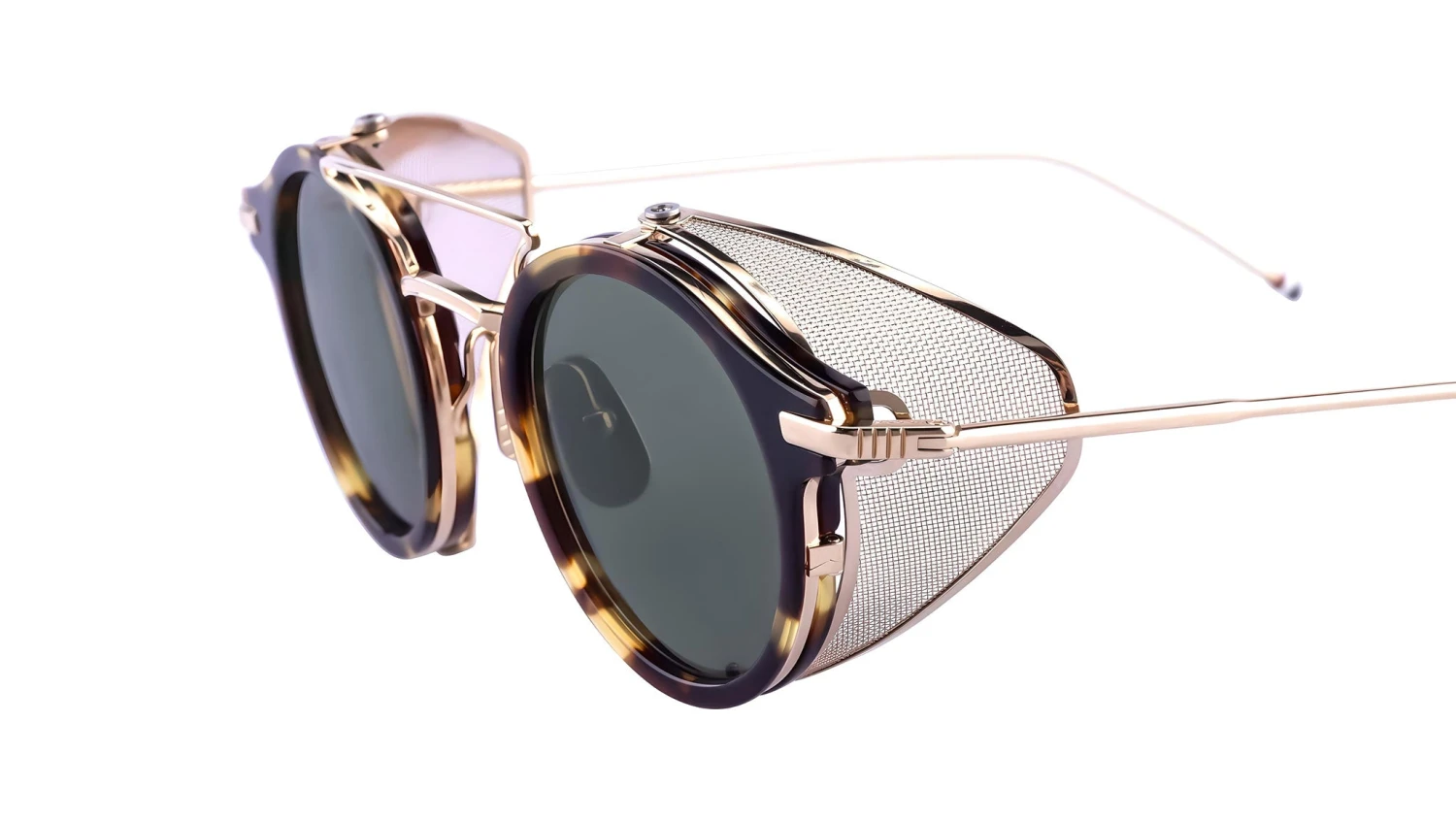 The Thom Browne eyewear collection, always true to its American DNA and inspired by mid-century aesthetics, is perfect for those who appreciate a sleek and sophisticated look; the UES804A 215 model features honey tortoise acetate and 12k gold-plated titanium, green lenses, a unique round shape with side shields, signature 4-bar detailing, striped enamel temple tips, and is elegantly presented in an eco-leather case, making it an ideal choice for individuals who exude confidence and wish to tell a story through their fashion statement.