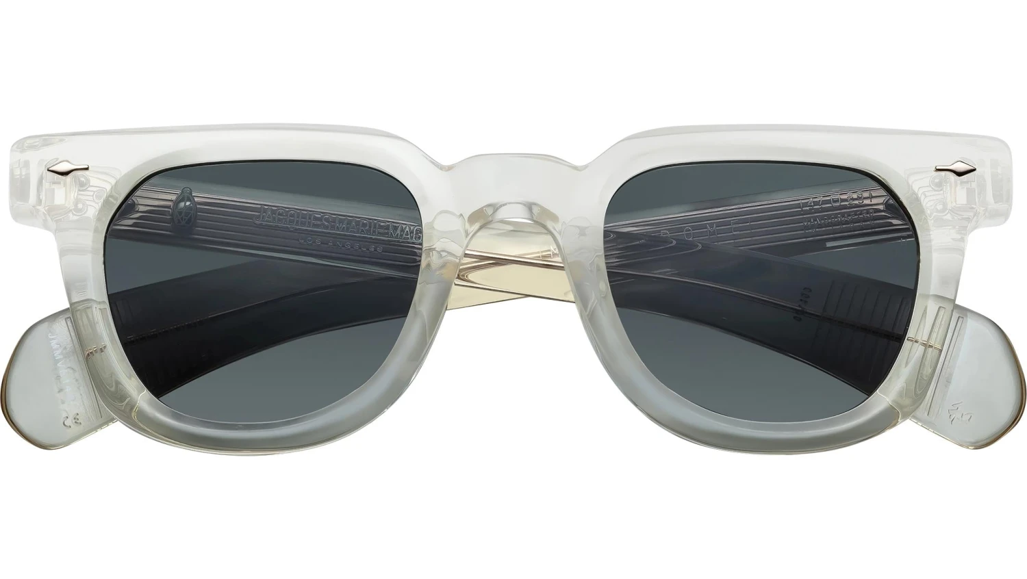 Crystal 10mm cured cellulose acetate frame with custom double-laminated acetate temples, detailed with precious metal hardware and green lenses. Features a light gold signature arrowhead front pin and an exposed light gold wirecore with fine hairline engraving. Equipped with light gold tension-secured custom 7-barrel hinges for durability. Spruce CR-39 lenses include a backside anti-reflective treatment and provide 100% UV protection. Panto shape.