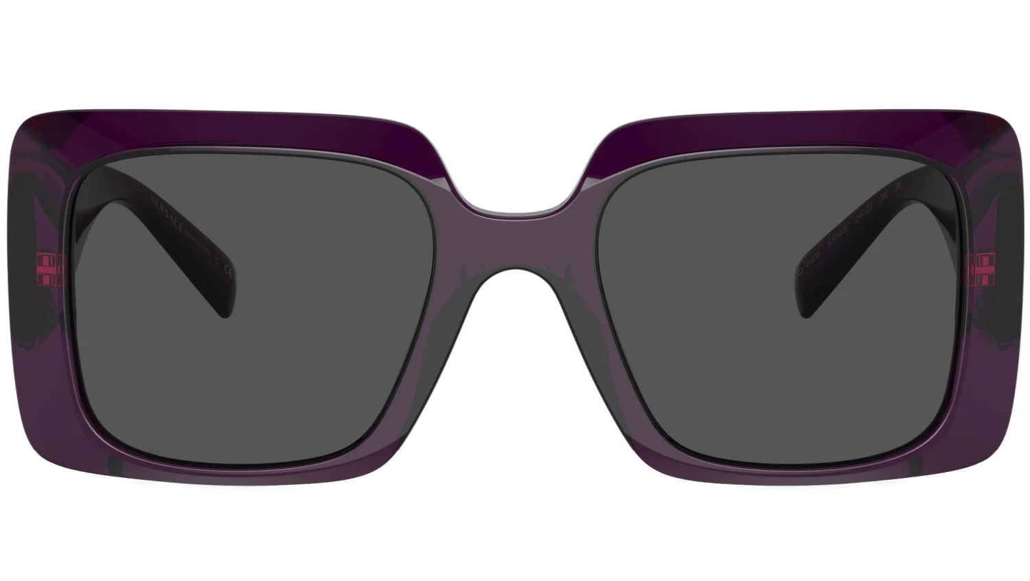 Versace sunglasses for women model 4405 featuring transparent purple full rim acetate frame and base 6 dark grey lenses. High bridge fit. Frame line: Fashion Id. Brand code: 0VE4405. Color code: 538487. Authorised Versace Eyewear Online Reseller. Your glasses will come including the original case and accessories and will be covered by 12 month global warranty.