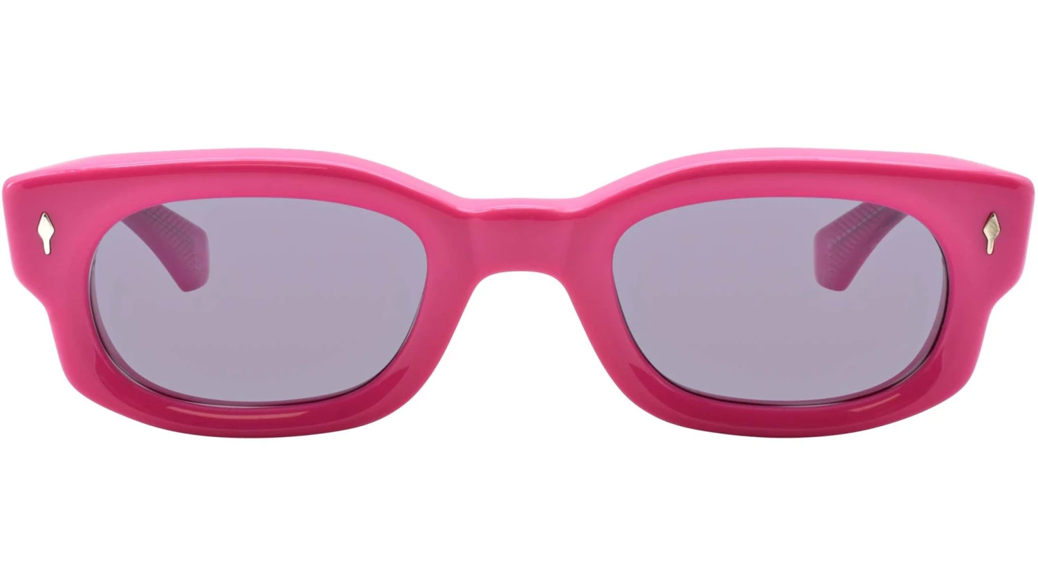These sunglasses boast a cured cellulose acetate frame in a vibrant pink, complemented by custom double laminated acetate temples and grey lenses. The silver arrowhead front pin adds a stylish touch, while the silver inner wirecore features custom hairline engraving. With a silver tension-secured custom 7 barrel hinge, these sunglasses ensure durability and flexibility. The stone grey CR-39 lenses offer a 2 base lens design with a backside anti-reflective treatment for enhanced visual clarity.