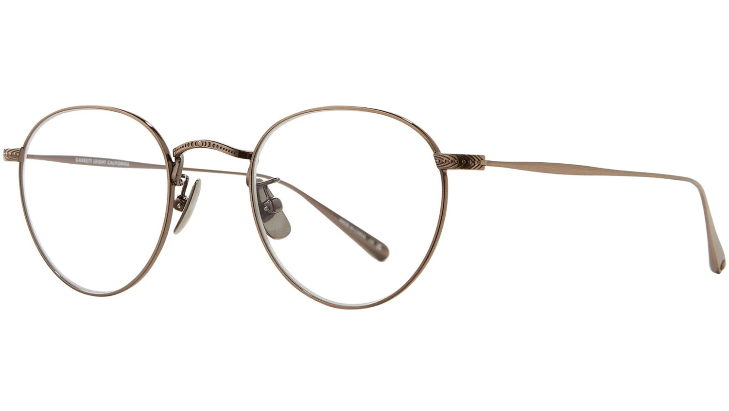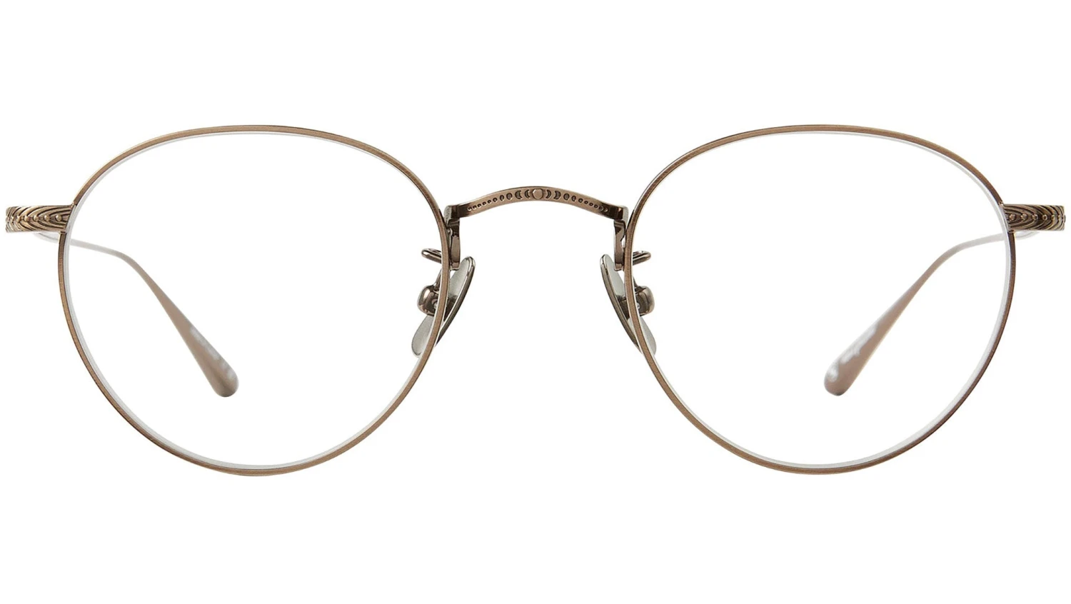Garrett Leight William glasses featuring antique gold round metal frame and demo lens lenses. The William optical frame features a shallow, teardrop-shaped P3 design, combining a classic aesthetic with contemporary refinement. This frame showcases intricate bridge filigree and end piece detailing, along with sturdy all-metal temples. Equipped with screw-in titanium nose pads, it ensures a customized fit for all wearers. The frame can be paired with the William Clip for sun protection. Additional technical specifications include hand-finished optical quality CR-39 lenses, a moon filigree bridge, 4 base lenses with a backside anti-reflective coating, and it comes with a GLCO soft case and cleaning cloth. This frame is suitable for unisex wear. Brand line: GLCO. Style code: 3073. Color code: ATG. Authorized Garrett Leight online reseller. Your glasses will include the original case and accessories and are covered by a 12-month global warranty.