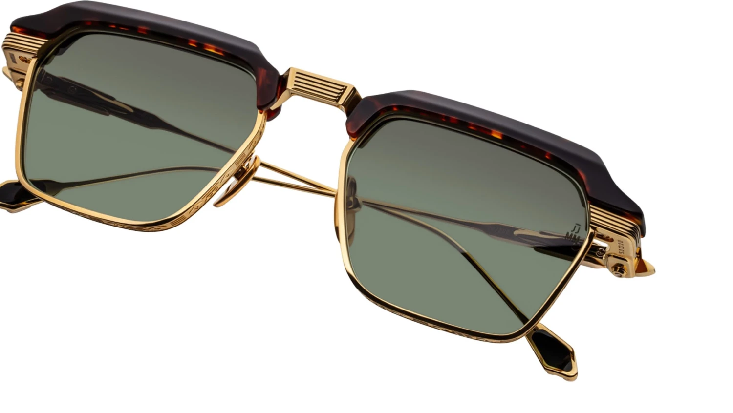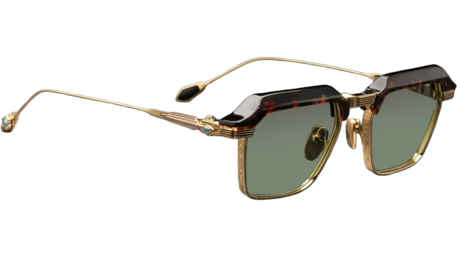 Gold 100% beta titanium frame with Havana cured cellulose acetate and green gradient lenses. Moon gold beta titanium temples with 18K gold-plated arrowhead and thunderbird cameos featuring turquoise inlay. Moon gold tension-secured custom monoblock hinge. Moon gold Chimayo-engraved eye rim. Beau cellulose acetate details. Custom nose pads with logo and hairline engraving. Brush glass gradient 4-base lenses with backside anti-reflective treatment. 100% UV protection.